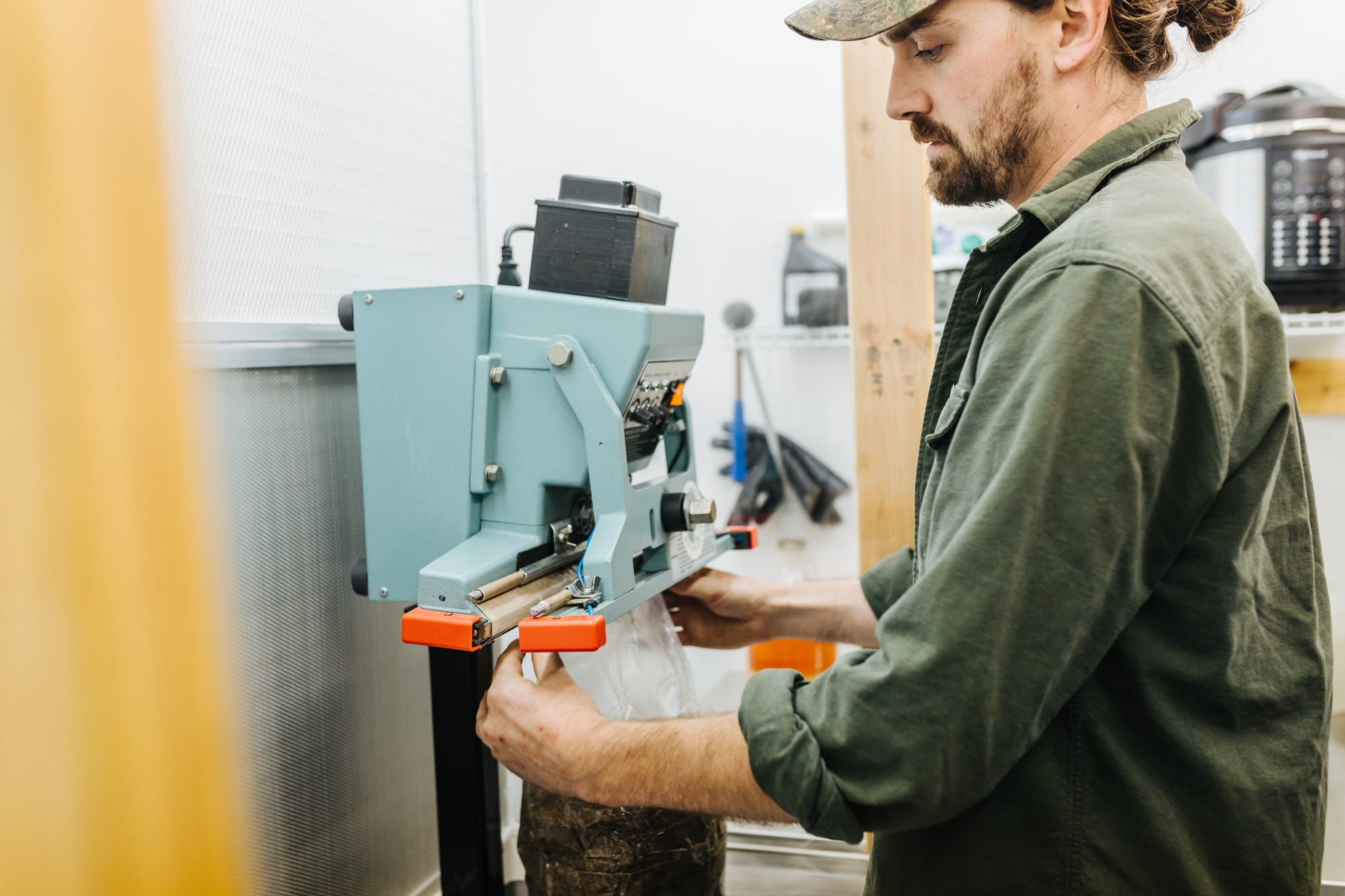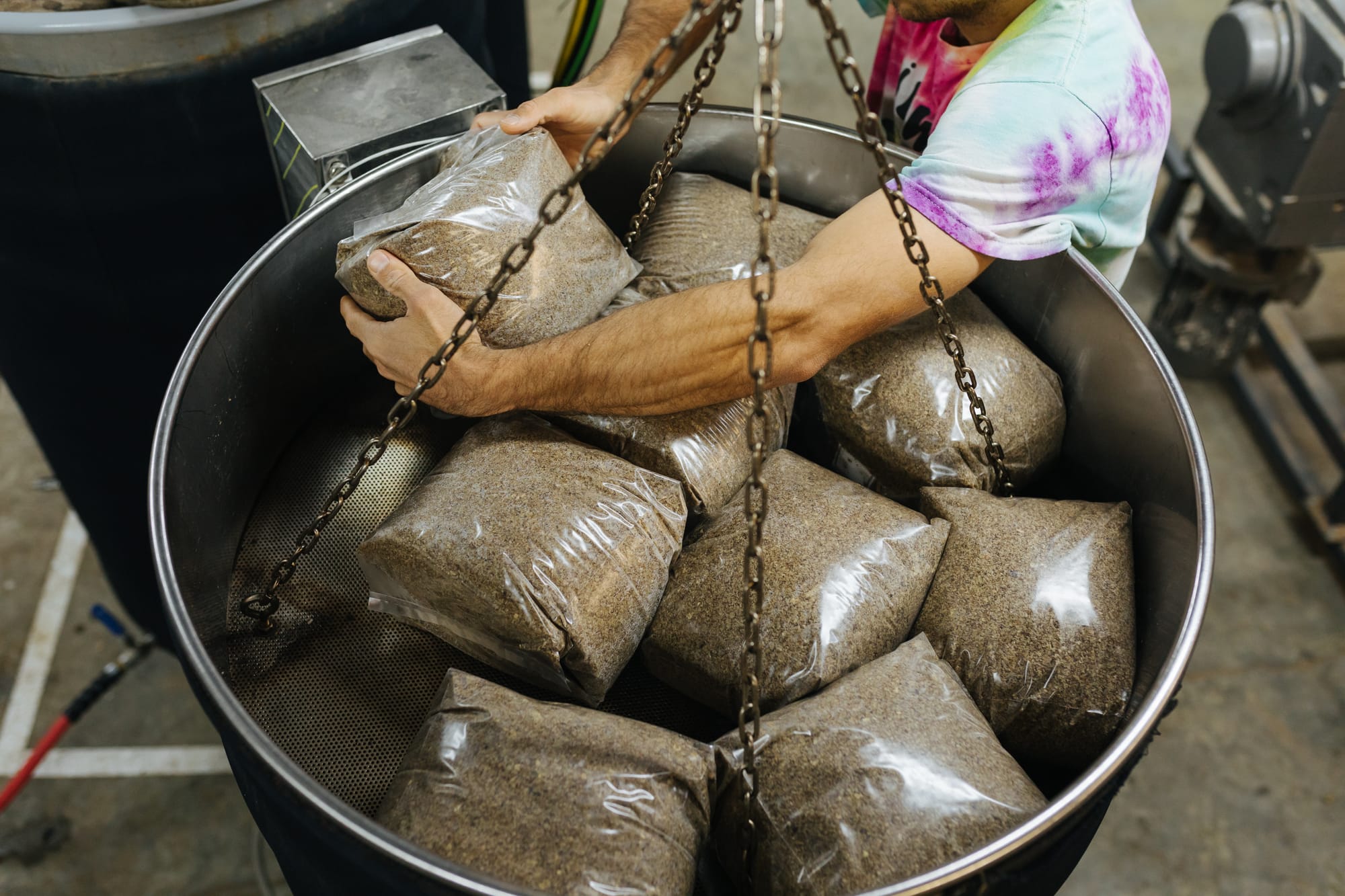 Midway sources its grain spawn, or mycelium, from a New England provider. The bags are taken from the sterilized vats to cool, then moved to an ozone-sterilized room for inoculation where the New England spores are mixed with Tennessee substrate.