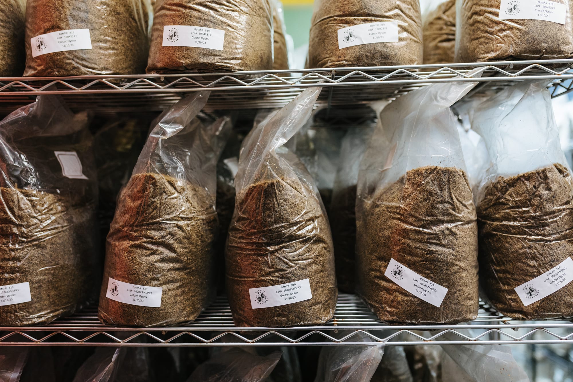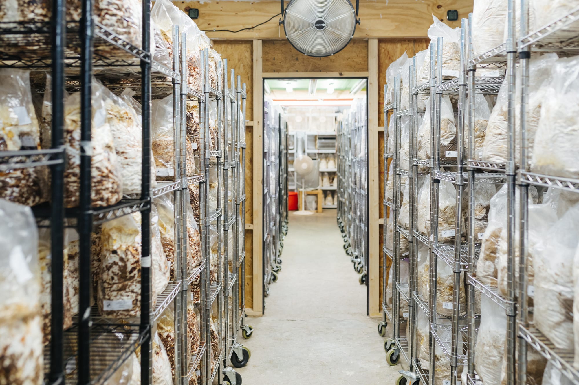 The inoculated bags line a room of 20 to 40 shelves, each holding 50 to 60 bags. Shiitakes, which incubate over a two-month period, sit across from oysters (two weeks) and the fast-tracking lion's mane.