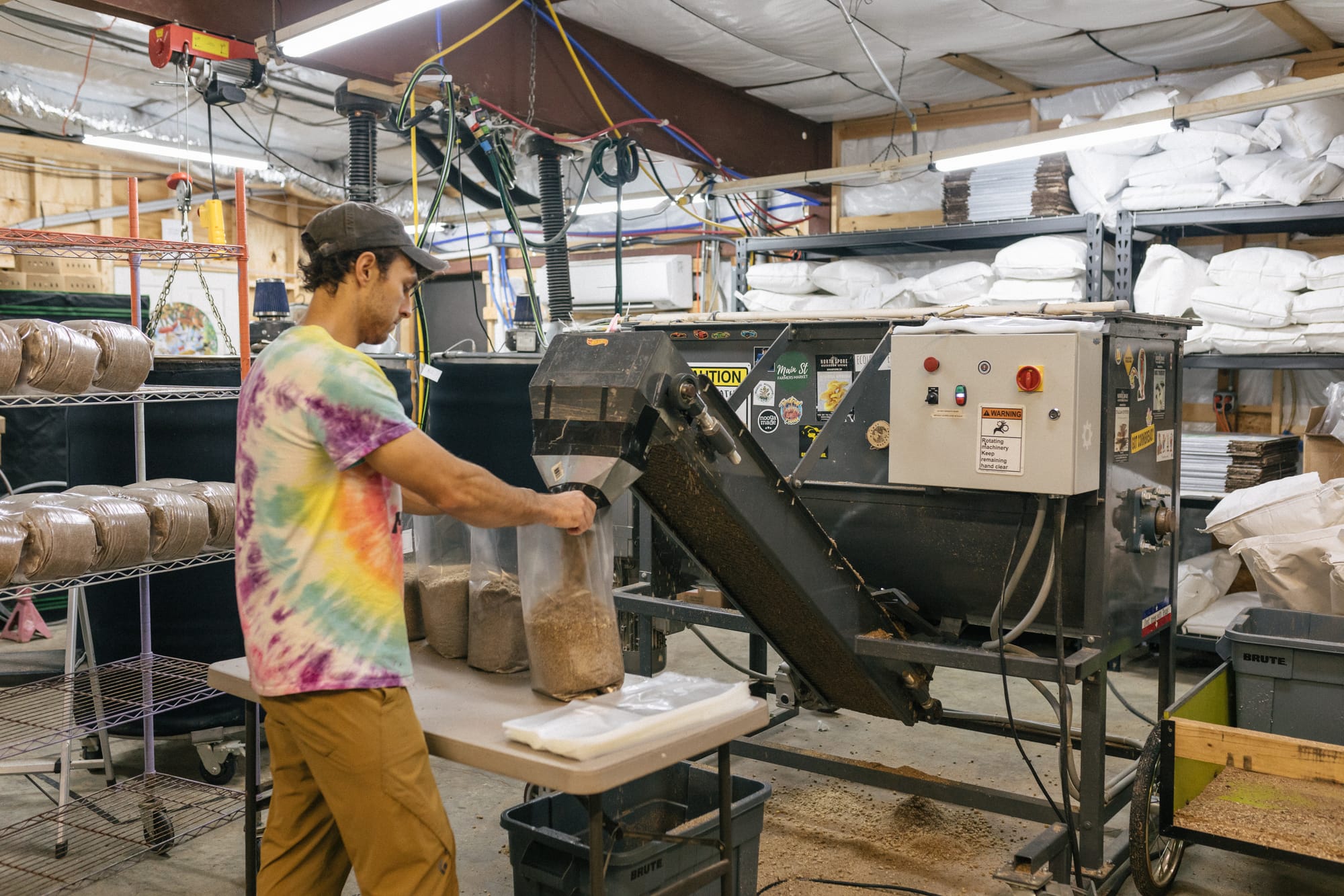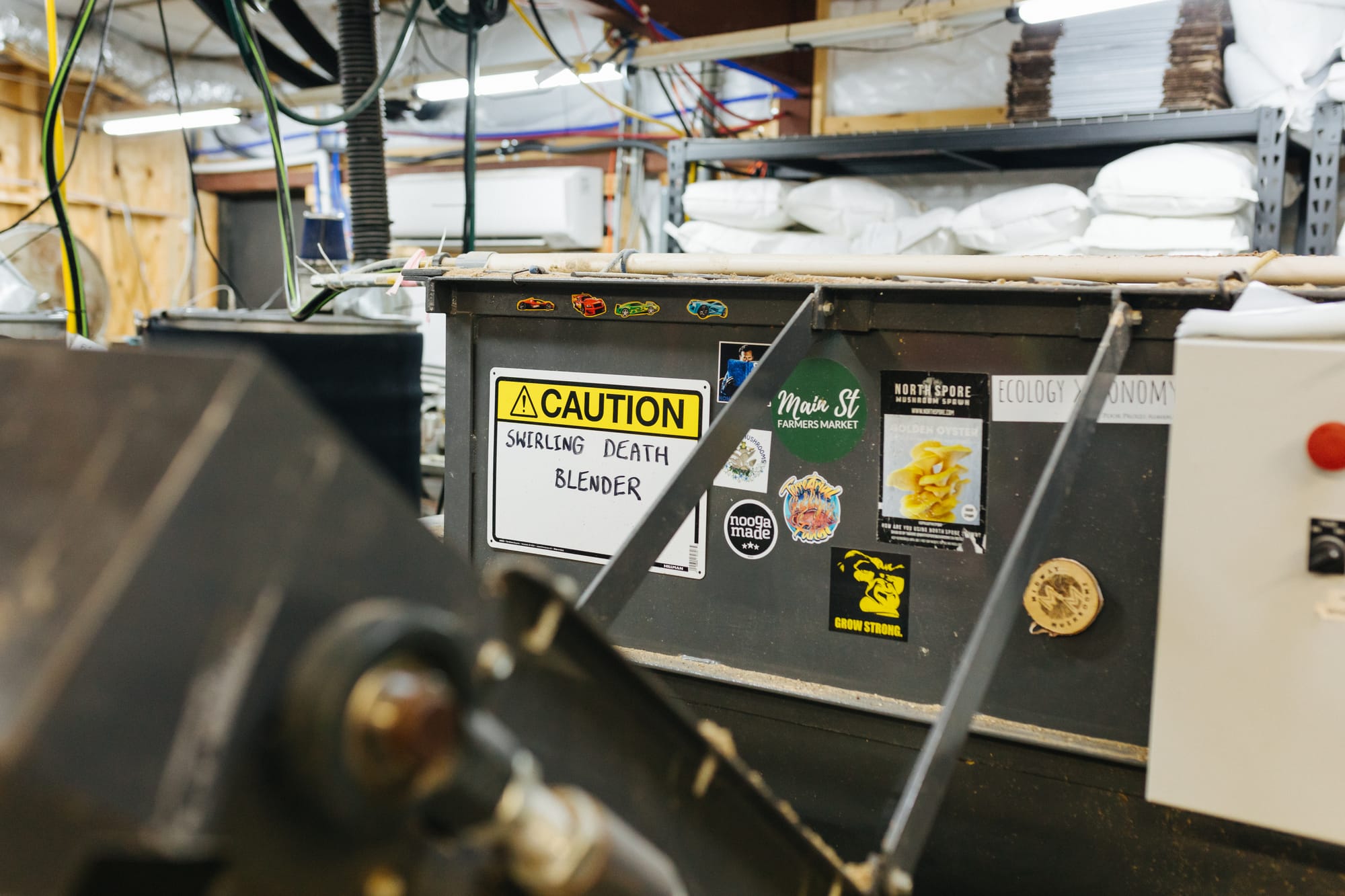 The Swirling Death Blender is a repurposed compost mixer from a nearby nursery that has a slight Fargo-feel to it. Midway Mushrooms uses fresh hardwood sawdust and pelletized soybean hulls to form a substrate onto which the mushroom will grow. It's not unlike preparing the soil for seeds.