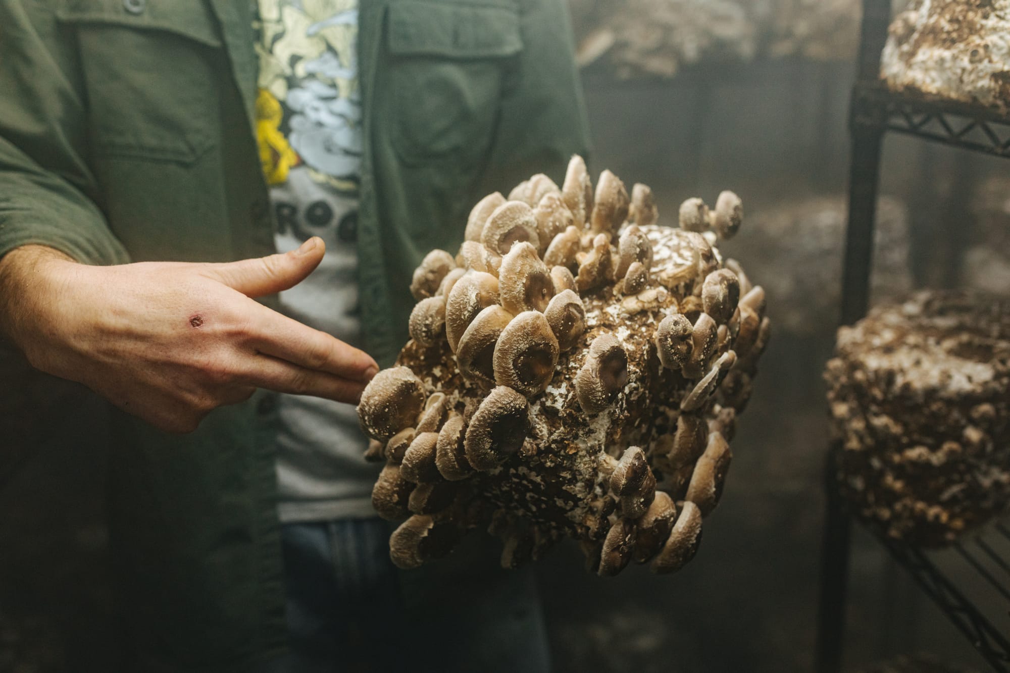 Midway's fruiting success rate hovers around 95-98%. Hobbs picks up a bag of fruiting shiitakes, which looks like somebody spilled Folgers inside. Thumps it like a watermelon.