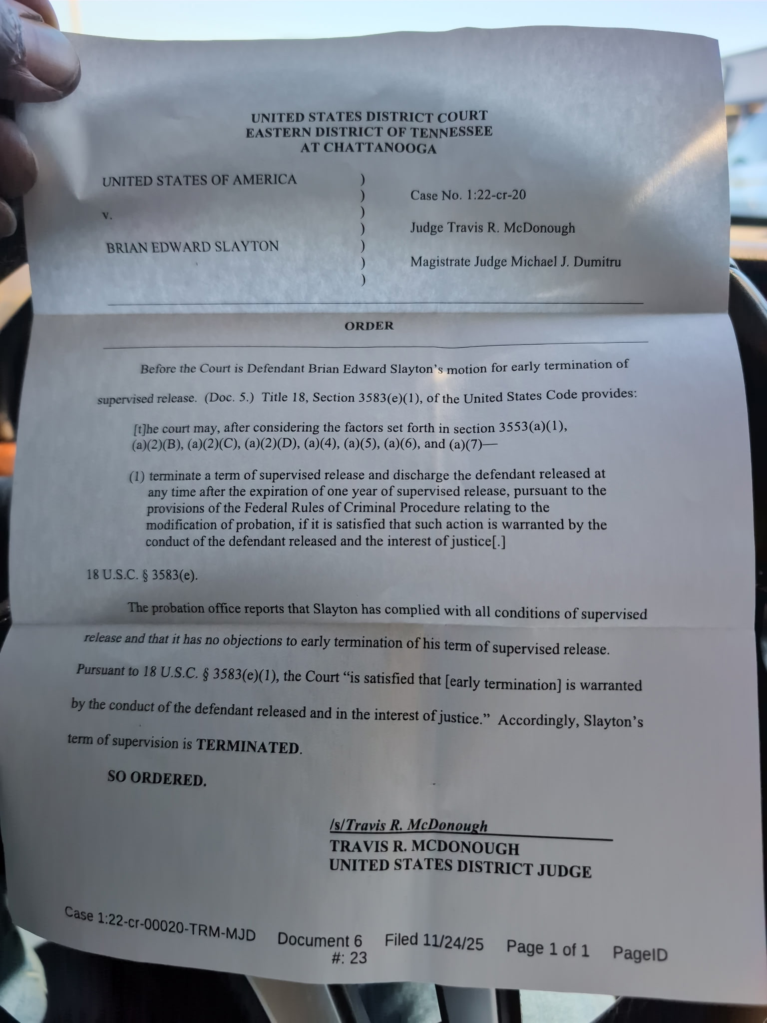On Monday, federal judge Travis McDonough signed documents terminating Bryan's probation.