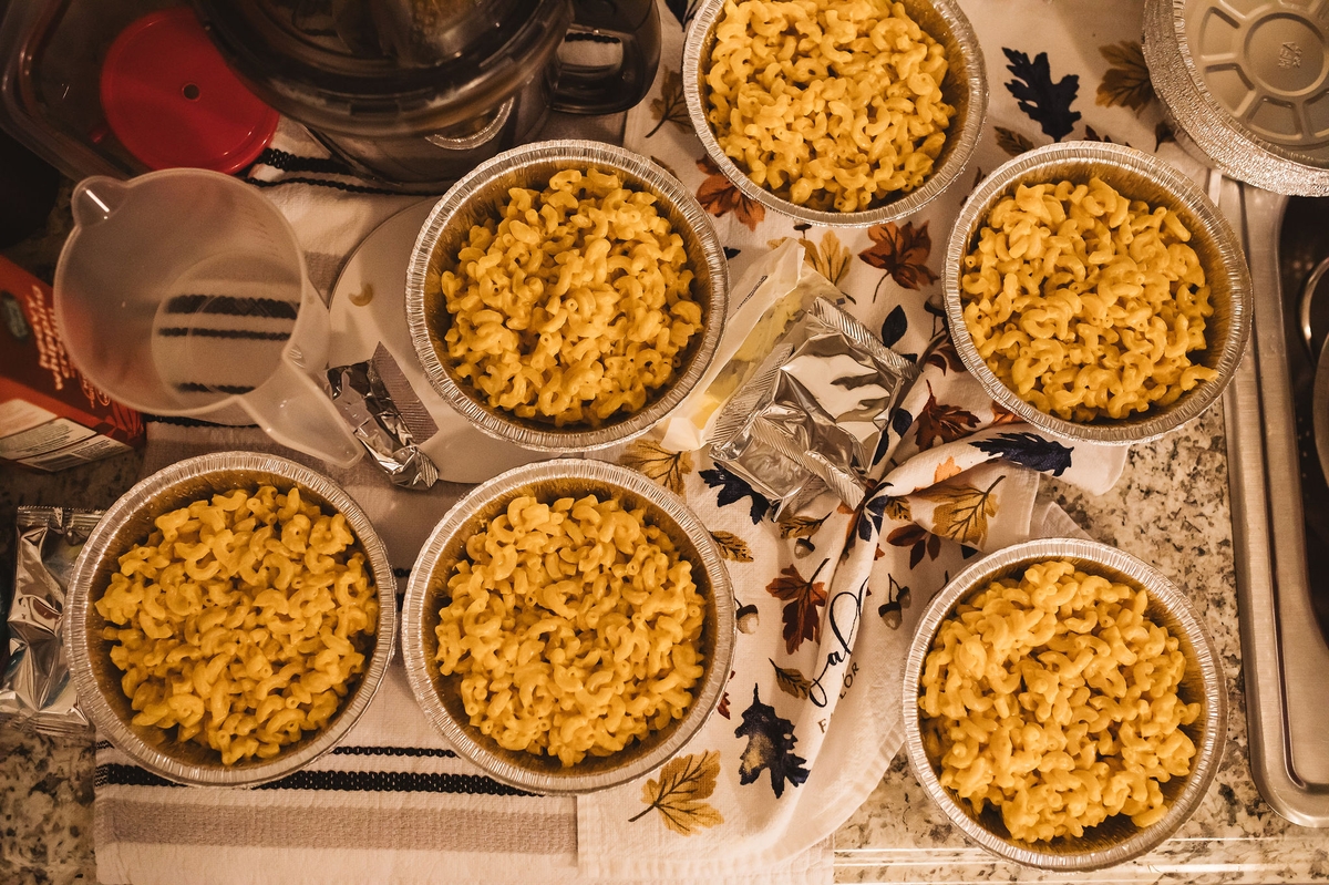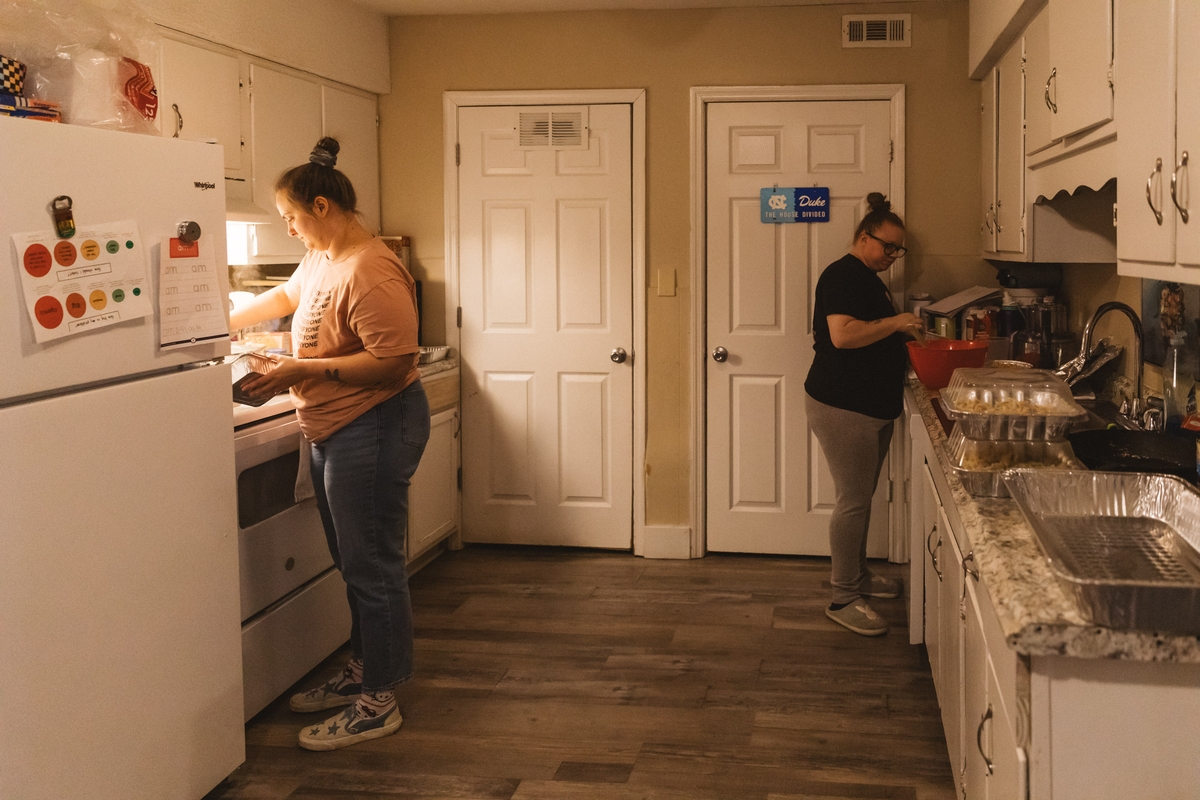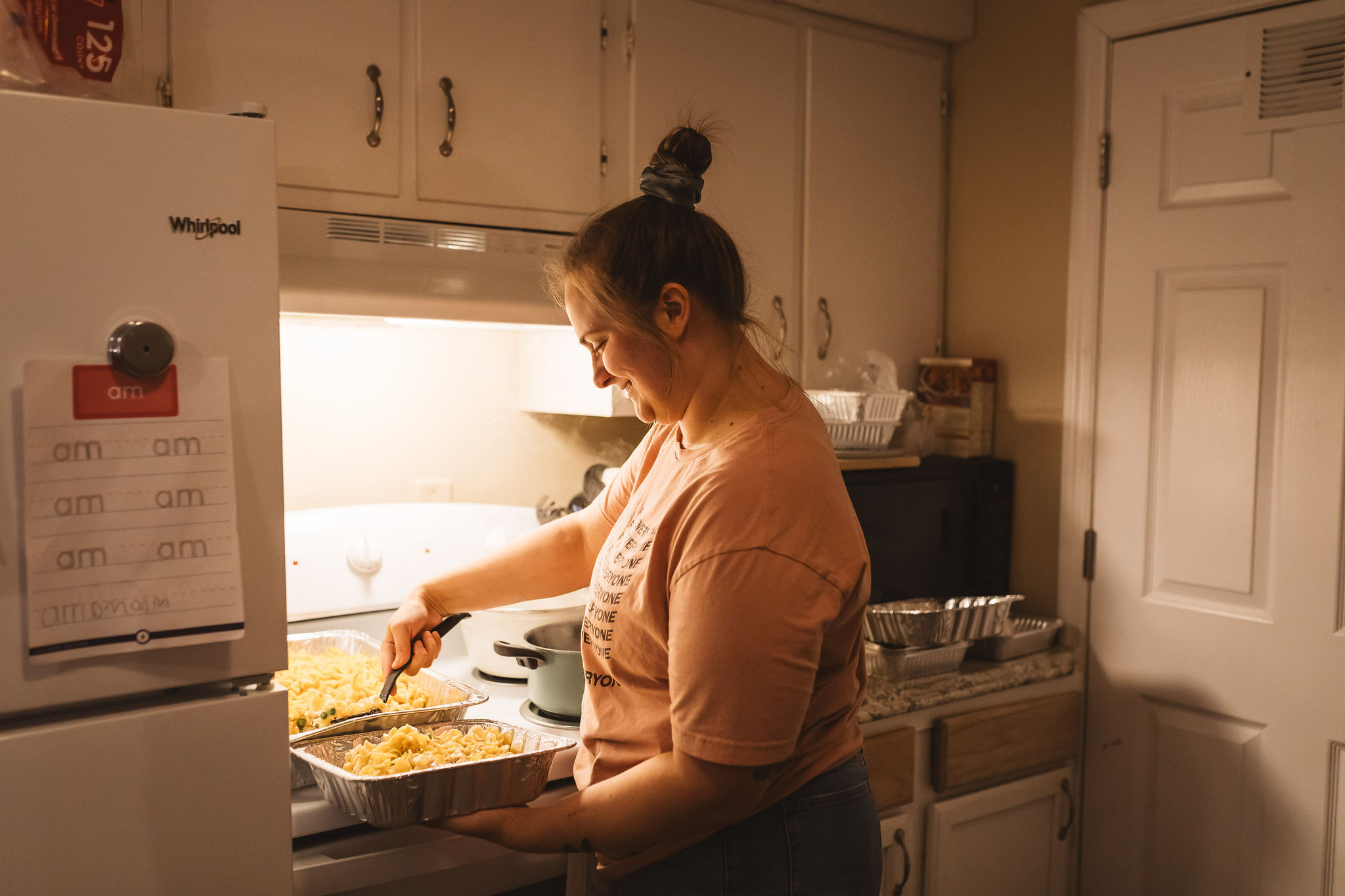 Morgan Meadors, 31, is near the stove, scooping chicken noodle casserole into a take-home pan. Near the sink, Brea Reed, 30, is spooning mac & cheese out of the pot.