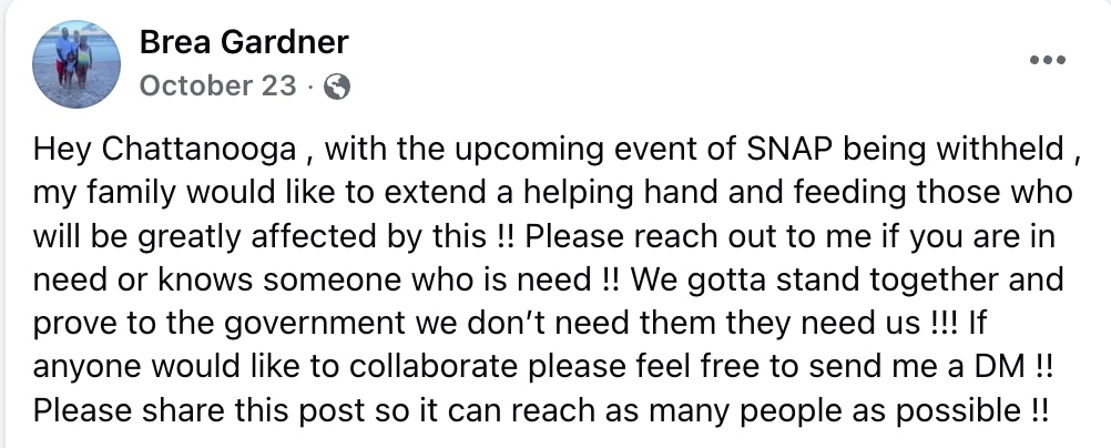 It began in October, during the SNAP crisis. Brea — she's married to local basketball star Shameca Gardner — posted on Facebook: we want to help.