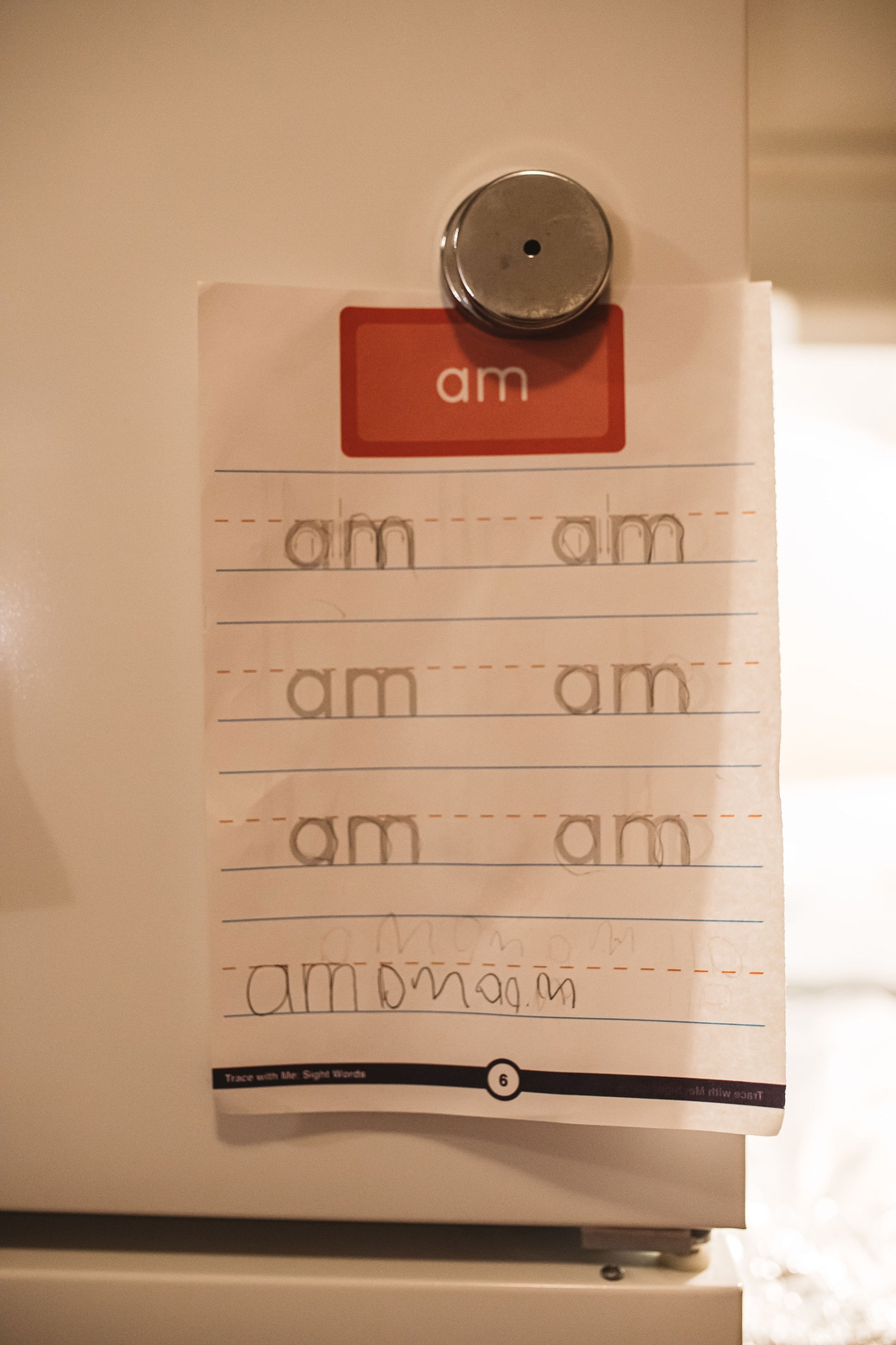 On a magnet on fridge door, Brea had hung her daughter Kallee's homework: she was tracing over the word "am."