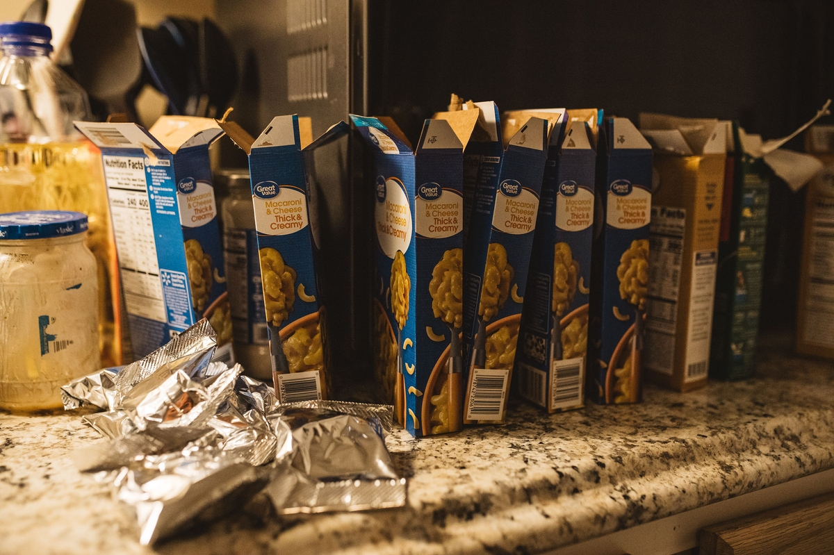 They've got stacks and shelves of baby food, Once Upon a Farm treats, canned chick peas, whole grain pasta, yellow rice, white-iced cupcakes, egg noodles.