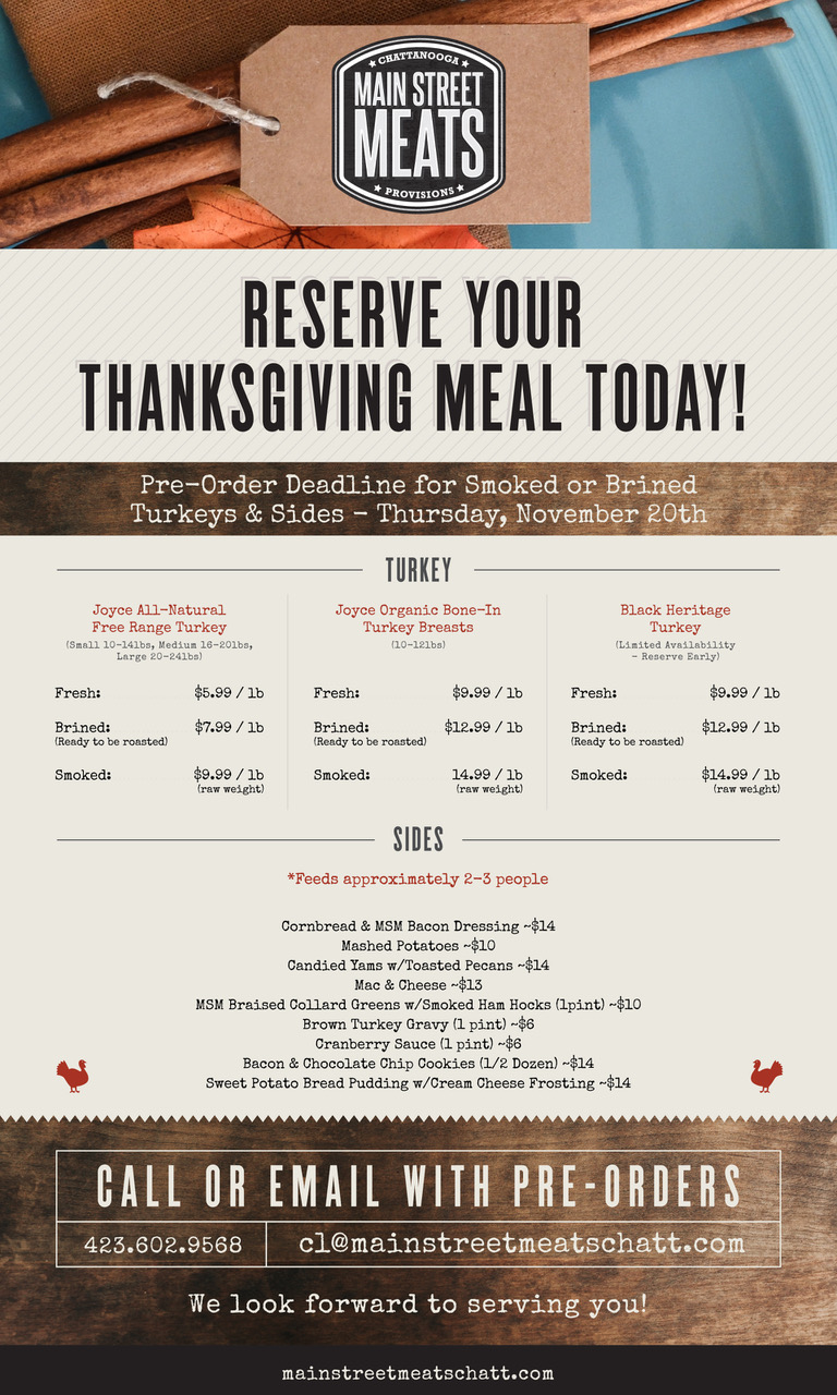 The deadline for ordering is Nov. 20. Email cl@mainstreetmeatschatt.com or call 423.602.9568.