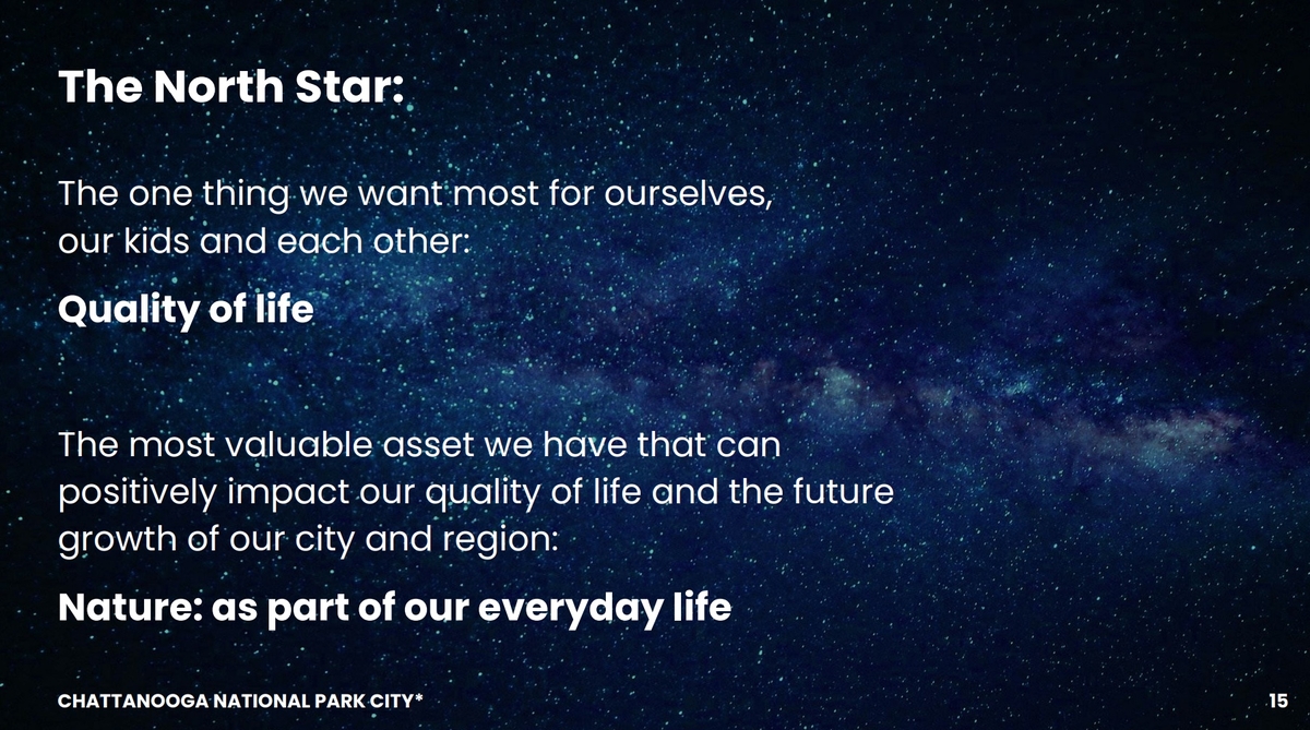 He's leading the push — the city is shifting this effort to Friends of Outdoor Chattanooga, and he hints at this work as the new Chattanooga Venture — that will identify and fund ideas for our future as a National Park City.
