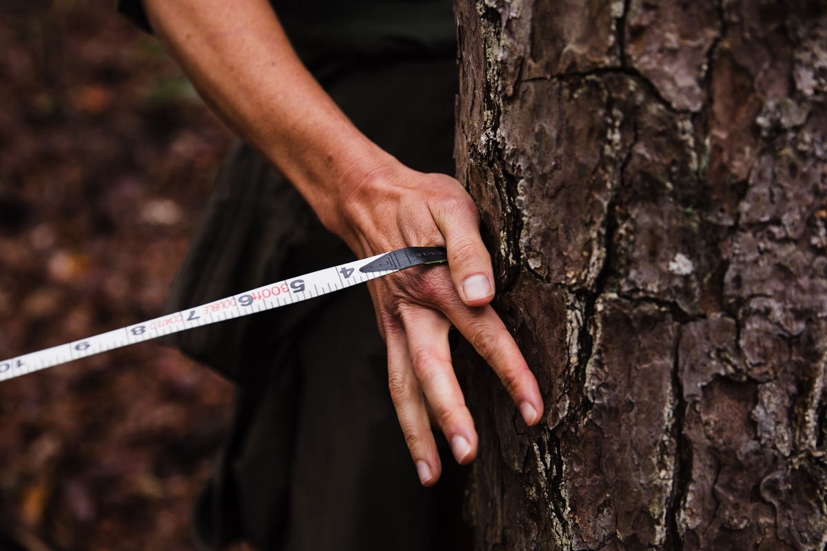 He takes a measuring tape and begins wrapping it chest-high around the trunk of the largest tree.