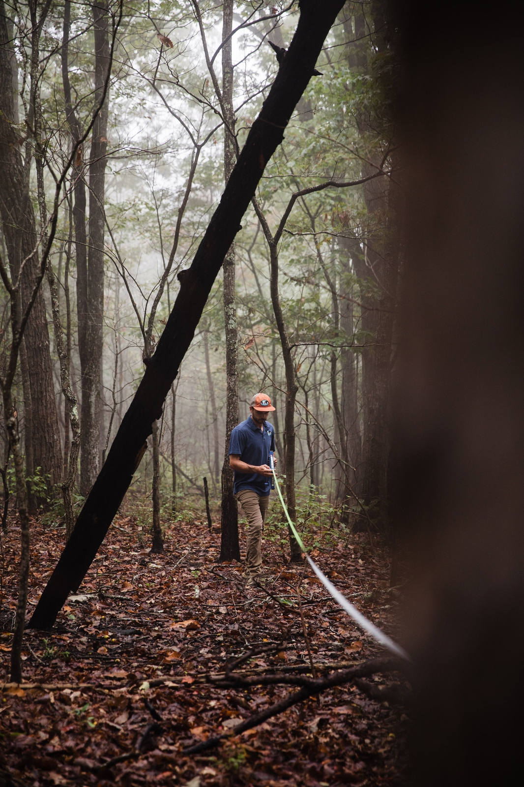 They begin to measure all the trees within a 35-foot radius, as this short leaf pine — the witness tree — stands as the central axis.