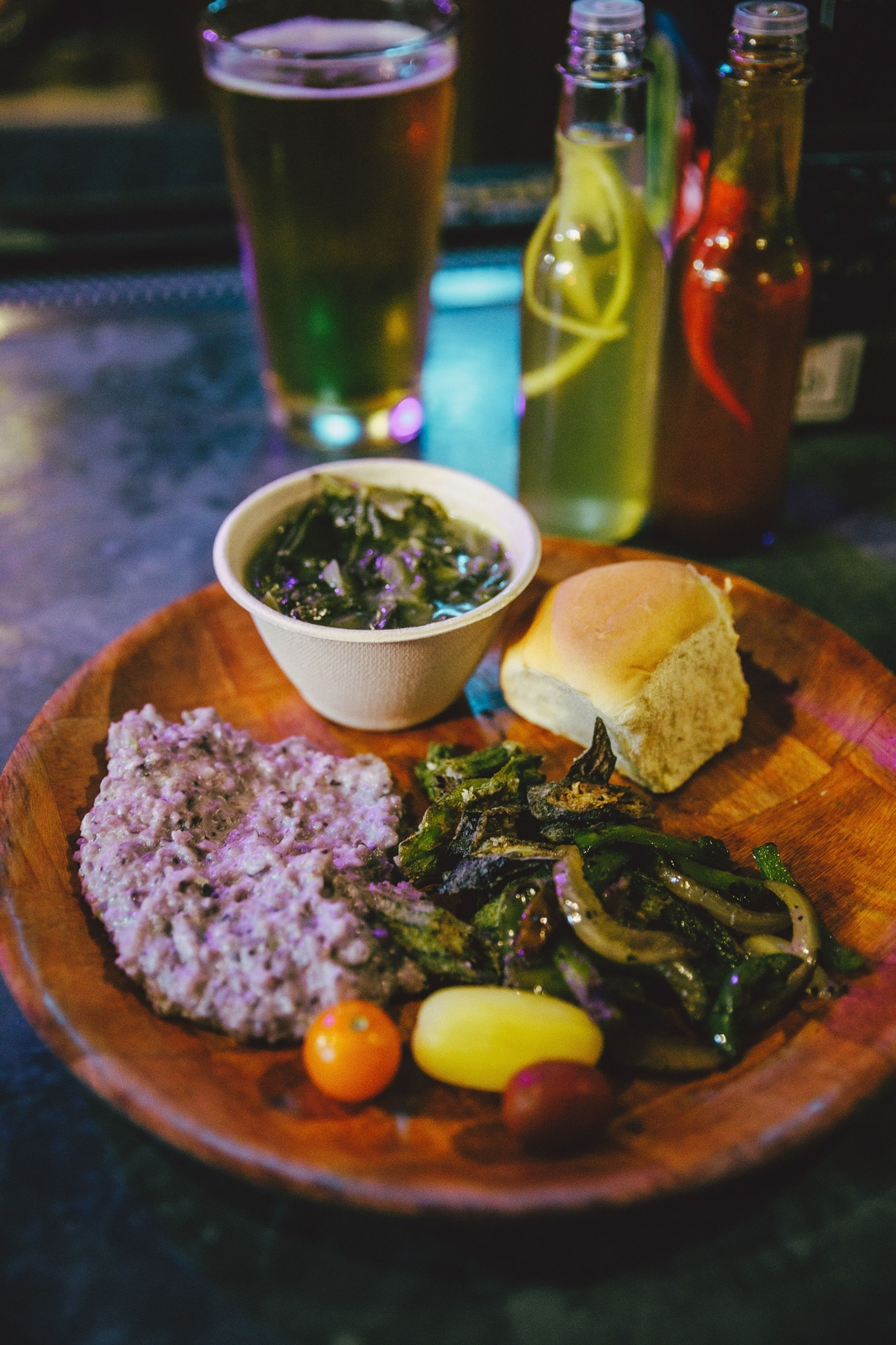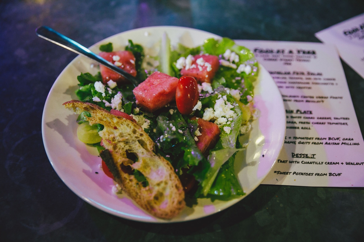 So, the stars aligned: as we all ordered dinner, the food we ate was grown by the man drinking beer next to us. Chef Eddie Bridges — bravo — prepared okra, grits, possibly the best greens I have had in years, and a watermelon and feta salad I could eat in pounds, not plates.
